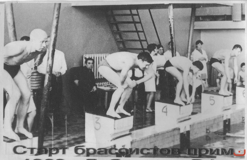 Старт брассистов Примерно 1969 г бассейн геолог 1)Лобаненкл Влад Федорович 2)Чуманов Юрий 3)Неизвестный 4)Сунцов Александр Павлович