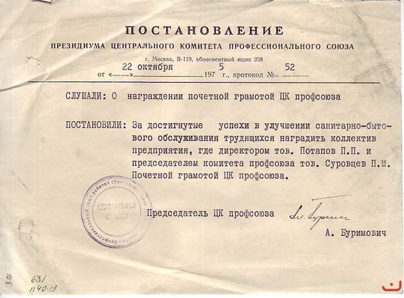 Постановление ЦК профсоюза судостроительной промышленности по санитарныо - бытовому обслуживанию трудящихся