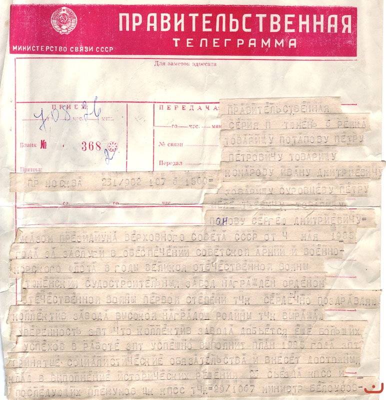 Телеграмма Министра Судостротельной промышленности СССРБелоусова