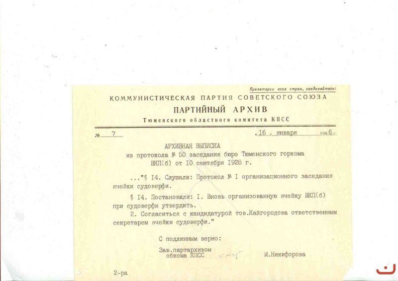 Главная » Общезаводские документы » Так начинался завод » Архивная выписка из протокола №50 заседания бюро Тюменского горкома ВКП(б) от 10 сетября 1928 г Общее количество просмотров: 31,669,612