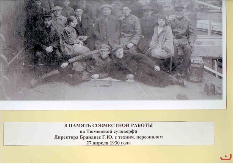 Программа судостроения на 1928-1929 годы Группа Строителей и судостроителей Тюменской верфи июнь 1929 г Архивная выписка из протокола №50 заседания бюро Тюменского горкома ВКП(б) от 10 сетября 1928 г Протокол №1 организационного собрания ячейки ВКП(б) при Тюсенской судостроительной верфи 4 августа 1928 г В память  совместной работы на Тюменской судоверфи директора Брандиес ГЮ с техническим персоналом 27 апреля 1930 г 15.jpg+ Группа работников верфи с первыи директором Слесарная группа 18.jpg+ Группа Плазово-разметочного цеха Тюменской судостроительной верфи 25 сентября 1931 г Брандиес Густав Юрьевич первый директор Тюменской судоверфи 20.jpg+ Работники Ленинградского Балтийского завода, командированные в Тюмень в 1923 году для организации филиала указанного завода Теплоход имени тов. Фрумкина, построенный в Тюмени Лениградским Балтийским и Механическим заводом Первая продукция завода лихтер Ямал Архивная справка о дате образования завода. Архивная справка о дате образования завода. Почетная грамота