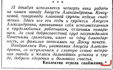 Обращение подписали ветераны завода: В.В. Важенин, В.Н. Доровиков, (кавалер ордена Трудового Красного Знамени), А.Н. Пинигин, Ф.С. Полевщиков, кавалер ордена Ленина, лауреат Государственной премии), Г.Н. Пигалев (кавалер ордена Трудового Красного Знамени), Б.М. Тавосин