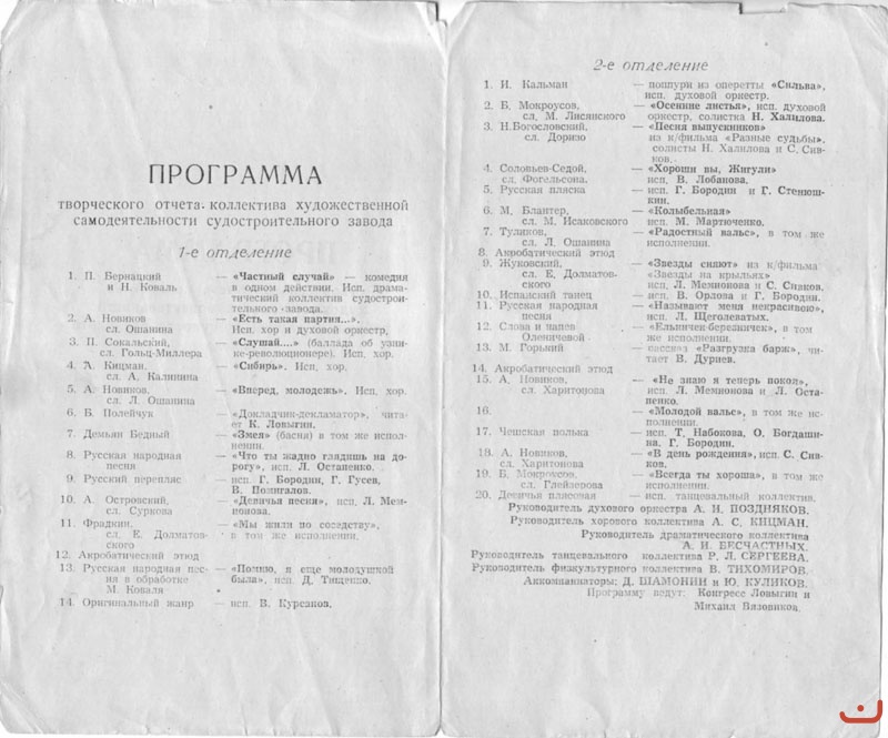 Заводской оркестр Бесчастных АИ бухгал  Шаболин Г ц 5 ц 12 Участники самодеятельности на отдыхе 9 Image0035+  фото Бесчастныз Image0030 Участники заводского хора прим 1956 г Image0034 Image0038 Mail0003 Mail0006 Mail0008 Mail0093++ Mail0105 OCR120226.jpg Праздник Нептуна на турбазе OCR120229.jpg 1988 встреча ц 7+9 Казанцева ГП  Самодеятельность Image0017+ ТС 70.04.24 № 16 OCR120225.jpg+ 1 Программа концерта 1957 стр 1 Image0030 2 Программа концерта 1957 стр 2 Image0030Image0028 Программа торжественного вечера 7 ноября 1957 года 3 Image0020 Программа концерта 1957 стр Image0030 Лебедев Кузнецова ТС66-7 Кузнецова Эльвира Носкова Лидия Санникова Любовь Лебедев Владимир Чижиков Шаболин Прысик  ТС66-43 Ныробцев ц9 ТС67-10 Отдых  ТС68-12 Отдых ТС68-12 Самодеятельность ТС68-11 Тищенко ТС 68-1 Самодеятельность ТС68-11 Крылов Анатолийц 15 Кокорин Виктор Асуп  ТС70-3 Семенов Анатолий Малцев Виктор Велижанин Александр Суглобов Владимир Прокопьевич Профилакт Завком ТС71-2 1)	Медведев АМ –КО 2)	Рычков ВГ- КО 3)	? 4)	Кураш ВВ –КО 5)	? 6)	Кураш ЮВ – ОТК 7)	Марков Николай Андриянович – механик ц 7 8)	? 9)	Жуков ИН – ОТК ц7 10)	Еремеев…работал в ОС и зав ДОСАФ 11)	Осипов  ОМА Верхозин Валерий ц5  Мемнонова Любовь ц13 Лимонов Николай ц 5 Соловьев Валенин ц 21 Фролов Алексей ц11 Хайминина Валентина ц 3 Шашорин Николай ц15 Анбаев Ярков Негамедзянов   ц11 Ленин - токарь Чижиков Ива  Дзержинский Шаболин Гннадий Забелин А-Присик Дмитрий Емельянов Анатолий ц 10 Емельянова  сестра студентка