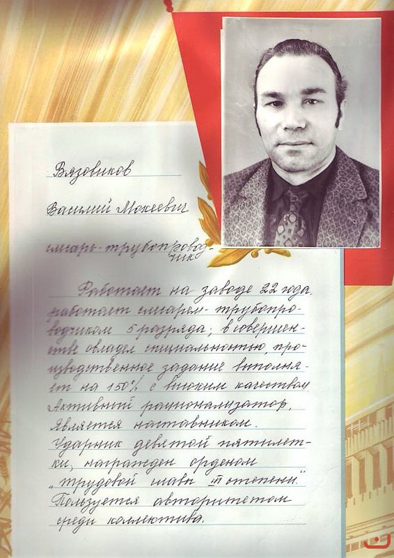 Обращение подписали ветераны завода: В.В. Важенин, В.Н. Доровиков, (кавалер ордена Трудового Красного Знамени), А.Н. Пинигин, Ф.С. Полевщиков, кавалер ордена Ленина, лауреат Государственной премии), Г.Н. Пигалев (кавалер ордена Трудового Красного Знамени), Б.М. Тавосин